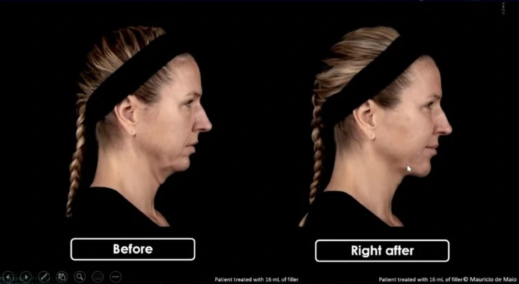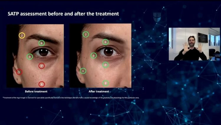 Wypełnienie skroni, doliny łez i uniesienie policzka – połączenie tych zabiegów daje efekt znacznej poprawy okolicy oka.